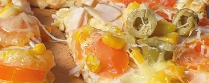 - Die Füllung darauf geben – zuerst etwas geriebenen Käse, dann geräucherte Hähnchenbruststücke, Tomaten, Maiskonserven, Oliven und geriebenen Käse.